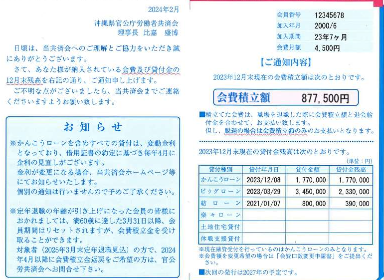 会員の皆様へ、会費及び貸付金の残高通知を発行いたしました。各職場宛てに順次配布を行います。