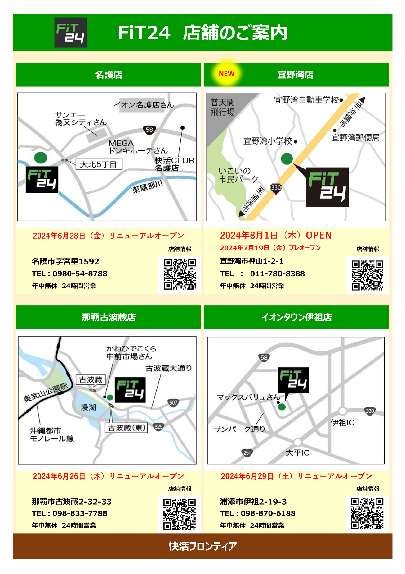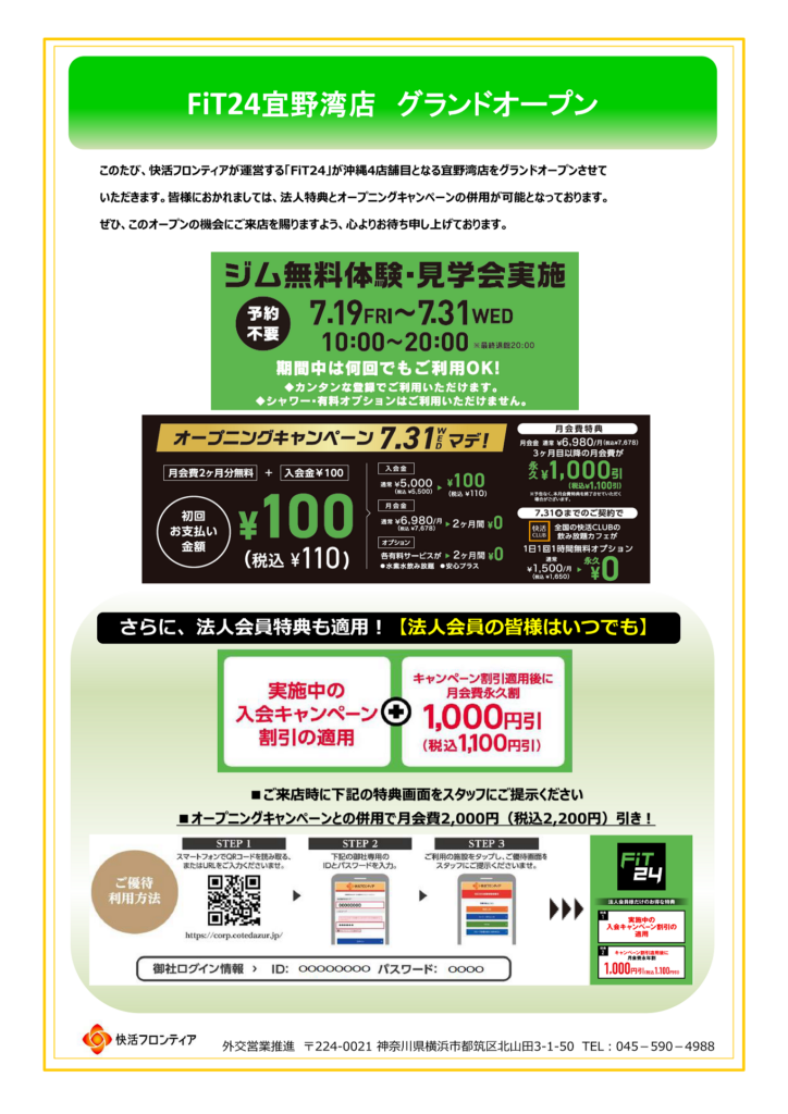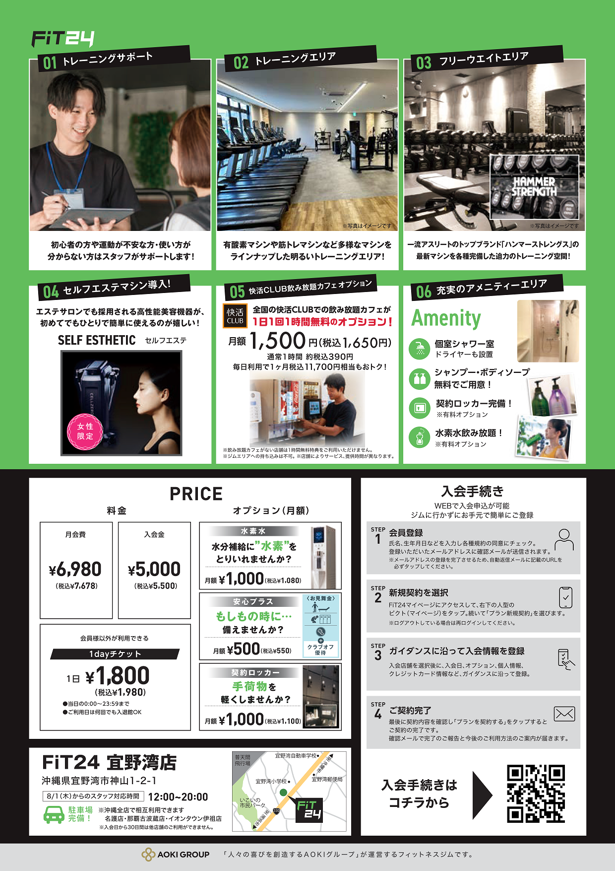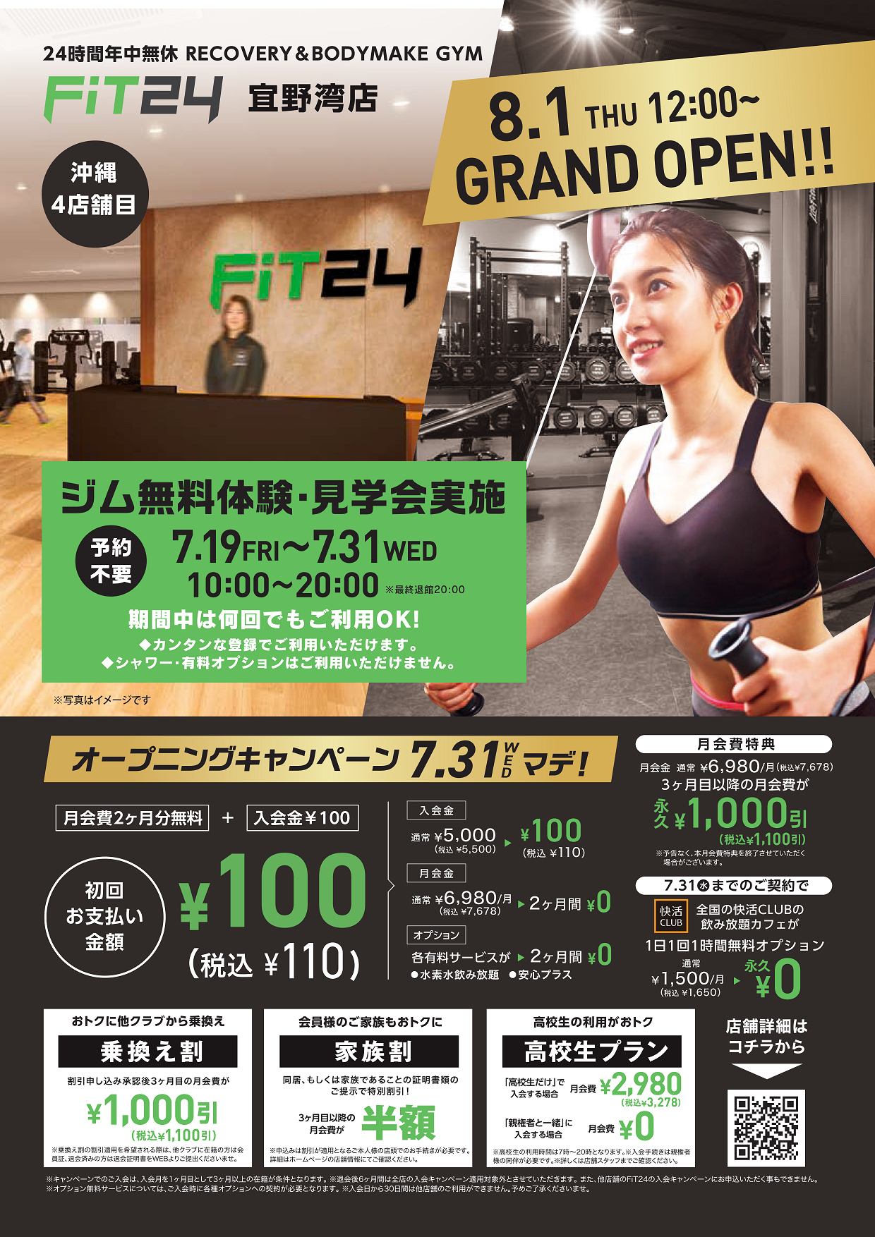 今回は、8月1日にFit24宜野湾店がグランドオープンに伴い、Fit24で今月までの期間限定でキャンペーンを行っています。